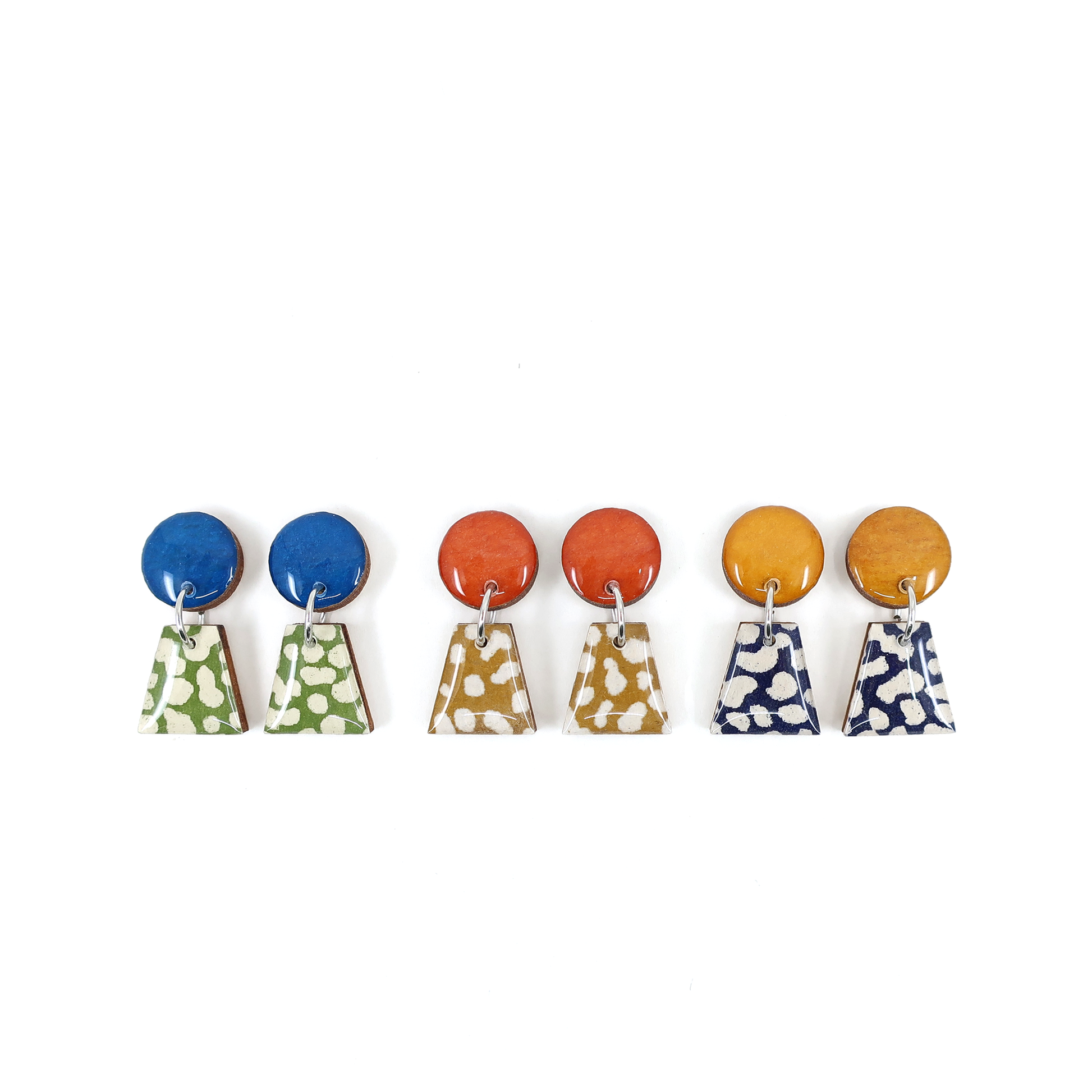Laser cut wood, Japanese Chiyogami, Japanese Washi paper, UV-cured resin, Stainless steel jump ring, Titanium posts and nickel free stainless steel backs.